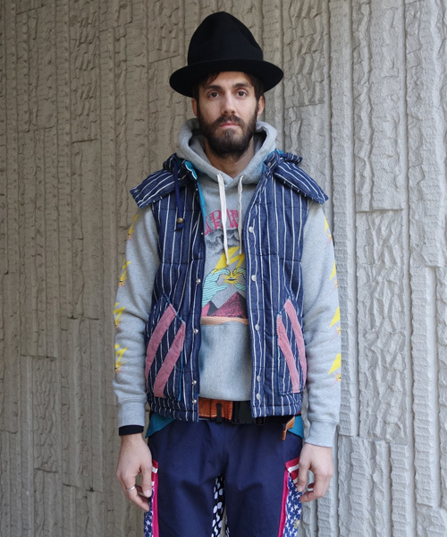 表地にデニムとコーデュロイをお使いし、USED加工を施したベストです。厚みのあるボディは防寒性も抜群。フードは取り外し可能です。