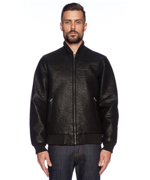 Self: 100% polyurethane Lining: 100% poly Zip front closure Zippered front pockets Banded edges