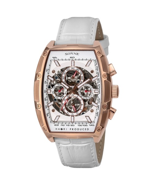 AngelClover SONNE―ゾンネ―とは、ドイツ語で「太陽」を意味します。古くから、時間を知るために使われていた日時計と深く関わる太陽がブランド名に由来しています。機械式時計のもつ凛とした佇まいと装飾の美しさにこだわったモノづくり。日常にスタイルのある男性に向け、大人の品と色気を演出するブランドです。 H018 高級感のある型押しカーフベルトを採用。両面スケルトン仕様でムーヴメントの動きを楽しめます。日付・曜日も一目でチェックでき、機能面も充実しています。 Spec 文字盤カラー:ホワイト 防水性能:日常生活防水 駆動方式:自動巻き ガラス素材:ミネラルガラス 表示方式:アナログ サイズ:ケース縦47mm×横39mm×厚み14mm/重さ87.5g 機能:デイデイト表示(日・曜日表示)24時間表示 保証:1年(自然故障保証) 付属品:箱/取扱説明書/保証書 --------------------------------------------------------- お気に入り登録のオススメ ▼商品のお気に入り登録 再入荷、残り1点、セールなどの通知を受け取ることができます。 ▼ブランドのお気に入り登録 新商品や再入荷など、いち早くブランドの情報を受け取ることができます。 ---------------------------------------------------------