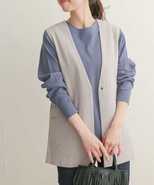 普段のコスタイリングにプラスするだけでこなれ感が生まれ、コーディネートがきまるベストをご用意。 ノーカラーのデザインが顔周りをスッキリと見せてくれるので、様々なトップスとのレイヤードを楽しめます。 大人っぽいデザインながらも、先染めのコットン100%の生地はかっちりした印象になり過ぎず、カジュアルな着こなしにも合わせていただきやすいアイテム。 ヒップが隠れる少し長めの着丈と、バックスリットを入れたことでボトムスとのバランスが取りやすく、パンツだけでなくワンピースやスカートとの相性も抜群です。 総重量 : 約280g ※商品画像は、光の当たり具合やパソコンなどの閲覧環境により、実際の色味と異なって見える場合がございます。予めご了承ください。 ※商品の色味の目安は、商品単体の画像をご参照ください。 ----------------------------- 透け感 :なし 伸縮性 :なし 裏地 :あり(胸下あたりまで) 光沢 :なし ポケット :あり -----------------------------