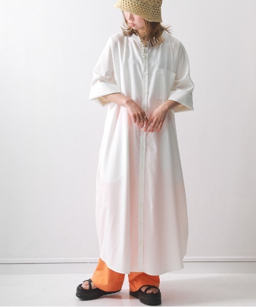 思わず目を惹く後ろ姿。程よくシアー感のあるバックレースがお洒落を作り出す、洗練されたバンドカラーのシャツワンピース。軽やかなレース×シフォン素材の切り替えデザイン。レーヨン混の柔らかな肌触りのシャツ生地と、後ろはシアー生地の上にレース生地をドッキングしました。さりげないシアー感で、肌が透けすぎず落ち着いた印象に。こだわりの配色で抜け感コーデを演出します。袖部分は2段階で折り返しやすい長さで、簡単に袖丈のアレンジが可能。その日の気分に合わせてシルエットの変化を楽しめます。裾はカジュアルスタイルを格上げしてくれるラウンドヘムライン。どの角度から見てもお洒落に映える≪n'OrLABEL≫バックレースロングシャツワンピースです。