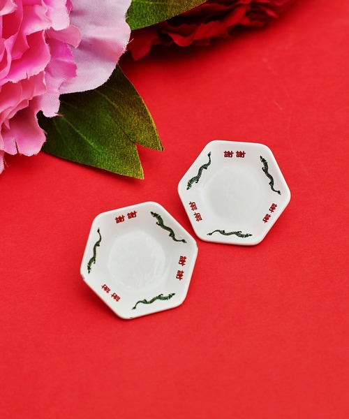 ※カラー名によりピアス/イヤリング が異なります。 ホワイト→ピアス ホワイトその他→イヤリング 架空のお店シリーズ。今回は中華料理屋「謝謝飯店」 そこで使っているレンゲやお皿、 メニュー表をイメージしたアイテムを展開。 チャーハンや天津飯をたっぷり盛りつけたい六角皿のアクセサリー。 存在感のある、大きすぎず小さすぎず程よいサイズ感にこだわりました。 ※画像の商品はサンプルです。実際の商品と仕様、加工、サイズが若干異なる場合がございます。 ※光の関係で実物の商品の色味とは若干異なる場合がございます。あらかじめご了承下さい。 実物に近い色味は詳細画像をご参考下さい。 IAMI IN FACT... CONCEPT ふつう の 中 に ある 違和感。 ながく 着る ための素材 と 仕様 シンプル であり 適度に 主張するデザイン いくつに なっても 消えることのない 少年少女の心を 大切に ※取り扱いの注意については取り扱い表示をよくご確認の上、着用をお願いいたします。