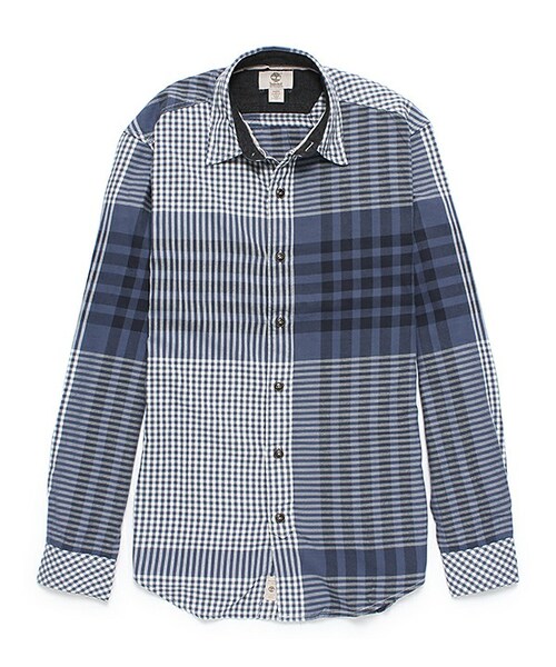 存在感のあるパターンのチェック柄シャツ。 スリムシルエットですのでニットの下にもすっきりと着用していただけます。チェック柄のパターンがユニークで1枚でもスタイルが決まるアイテムです。