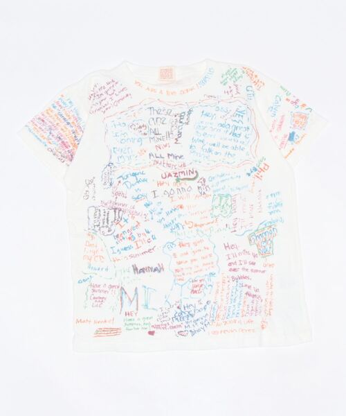 ジンバブエの綿とエジプトのギザ綿をブレンドしたムラ糸を旧式の編機でゆっくり編み上げた天竺素材を使用した半袖Tシャツ。 飽きが来ない独自の風合いのアイテム。 全面に書いてある寄せ書きの色がとても綺麗な為、文字の集まりというより1つの絵のように見えるのがとてもいい雰囲気のデザイン。 文字が顔になっていたり小さいワンちゃんが描かれていたり細かい可愛さも散りばめられた1枚。