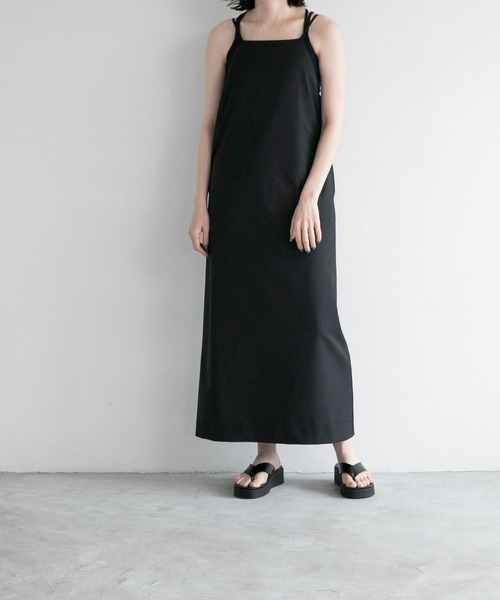 ■素材特性■ 豪州産ファインメリノウールとリサイクルポリエステルを使用した素で、長いシーズンで着用できる機能性素材です。 しわになりにくく、クールタッチなポリエステル性能に加えて、温調機能に優れたウールの特性がマッチした素材になっています。 ■デザイン■ 直線的なラインの胸元がポイントのキャミワンピース。 バックセンターはベントで足さばきも良く、ストラップはアジャスト可能、丈感や胸元のポジションを調整して着用出来ます。 ※こちらの商品は、パッケージも商品の一部となりますので、破損している場合、返品・交換を承ることができません。
