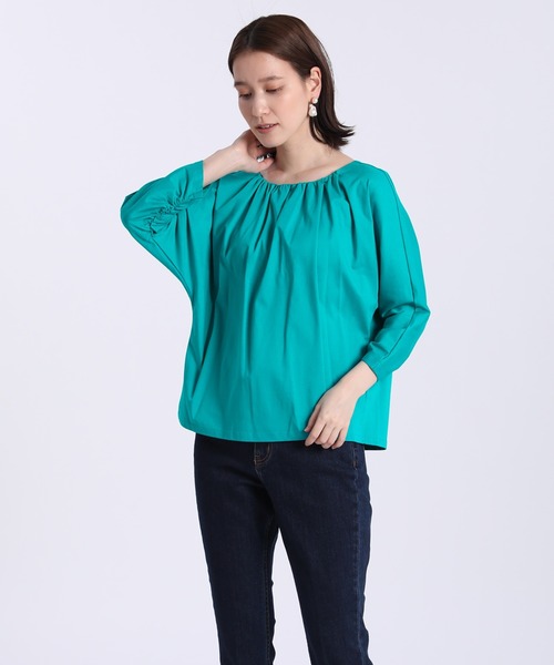 衿と袖の内側ににたっぷりとギャザーを寄せた、ブラウスライクなデザインカットソー。身体のラインを拾わず着られるゆったりボディに細身の袖のバランスがお洒落で、たくし上げても着られる7分袖で長いシーズン着用いただけます。光沢感を持つスムース素材は接触冷感加工を施しているので、触れるとひんやりとし真夏でも快適な着心地をアシスト。裾のサイドスリットでインでもアウトでもスタイリングが決まりやすく、パンツ派、スカート派どちらにもおすすめしたい一枚です。・水洗い可