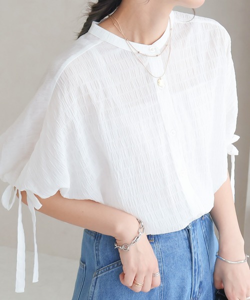 袖口のサイドリボンを施し、ナチュラルな可愛さをプラスしたブラウスが入荷しました。 ・甘すぎないディテールもプラスして大人可愛いブラウスに仕上げました。 袖口リボンを絞ることでギャザーを寄せフェミニンなデザインに。 絞らずにラフに着ても◎ 気分やコーデの雰囲気によって、袖口のデザインをお楽しみいただけます。 首元はカジュアルに着こなしやすいバンドカラーを採用し、すっきりとした印象に。 ゆったりしたサイズ感のドルマンシルエットで、リラクシーな着心地を実現。 体のラインを拾いません。 後ろが長めのテールカットもヒップ周りもさりげなくカバーします。 ・凹凸加工を施した涼し気な素材。 凹凸加工を施すことで表情のある表面感を実現しました。 さらりとした肌触りで、とても柔らかな着心地が魅力です。 程よい透け感があるので、涼し気で女性らしい印象に。 春から秋までロングシーズン着こなせる素材と袖丈が魅力です。 しわになりにくくお手入れしやすいのも嬉しいポイントです。 ※ご覧いただいている環境によっては、実際のカラーと異なって見える場合がございます。あらかじめご了承くださいませ。