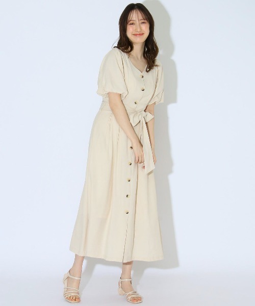 美シルエットなウィルの愛されワンピース♪【Design】・シンプルなシルエットの中に大きなバルーンスリーブが特徴のワンピース。・前後にウエストダーツを4本づつ入れることで360度どの角度からでもスタイルが良く見えるようにシルエットにこだわっております。・ボリューム感のあるお袖にすることで少し甘さをプラス。・バルーンスリーブが崩れないように内側にチュールを付け、立体感をキープしております。・前ボタン開き仕様。・共布のリボンベルト付き。・シーンを選ばずにお使いいただけます。【Fabric】・ポリエステル素材なのでシワを気にせずにお召いただけます。・手洗い可能なのでお手入れも簡単。・エクリュ、ピンク、ブルー、ブラックの4色展開となります。【Care】手洗い可能M:(02):着丈118cm/バスト100㎝/肩巾32㎝/袖丈28㎝/ウエスト76㎝/裾回り180㎝