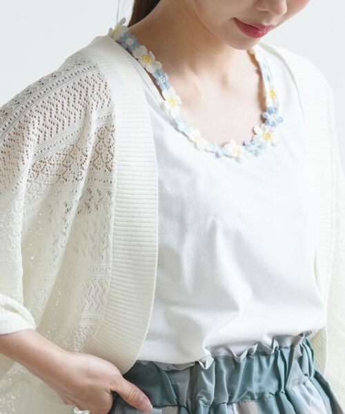 顔周りにお花が咲いた♪ フラワーレースタンクトップ カラフルなフラワーレースが首元を彩るタンクトップ。 レイヤードのちら見せにも使えるおしゃれアイテムです。 アクセサリーのような華やかさもあり女性らしくフェミニンなスタイリングに。 後ろはV字になっているので抜き衿のアイテムを合わせても素敵です♪ 裏地なし 伸縮性あり 薄手 織キズやだま等みられる場合もございます 洗濯:手洗い可