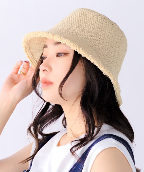 サーモ素材が爽やかなバケットハット。フリンジ風のデザインでトレンド感UP!軽くて柔らかいので疲れにくく、紫外線対策として気軽に被っていただけます。内側にはサイズ調節用のリボン付きなのでお好みのサイズ感で着用出来ます。頭囲(実寸):約~57.5cm:深さ:約11.5cm:つば:約7cm■サイズ調節可能商品タグ記載の価格につきまして、旧価格のものが混在している場合がございます。何卒ご理解のほど、よろしくお願い申し上げます。