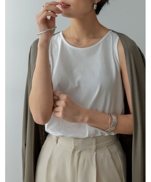 ベーシックだからこそ細部にこだわった1枚 コットン100%素材でナチュラルな風合いが魅力のシンプルなタンクトップ。 カーディガンやシャツのインナーとしてはもちろんのこと、1枚でもヘルシーに着こなせるアイテムです。 絶妙なサイドスリットや、丈感に前後差をつけるなど、抜け感を演出するデザインにこだわりました。 胸元も開きすぎないデザインなので、露出も気になりにくいインナーです。 イン・アウトバランスよく着られる丈感にも注目。 シンプルな中にも、こだわりを詰め込んだタンクトップに仕上がっています。 素材・着用感 肌当たりの良いコットン100%素材 ■モデル着用写真は撮影環境により、 多少実際のカラーと異なる場合がございます。 お気に入りショップにご登録いただきますと、 ショップニュースを、いち早くお届けいたします。