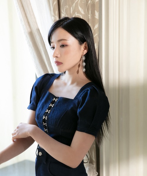 フロントホックとバックリボンがポイントのデニムトップス。スクエアネックデザインで首回りもすっきりとし、綺麗に見せてくれます。レースアップデニムパンツ(AG222PT0402)とセットアップとしてもご着用いただけます。※インディゴ製品 お取り扱い上のご注意この製品はインディゴ染めです。他の製品には味わえない自然な色合いがあり洗っていくごとに独特の色落ちの変化を楽しめます。取り扱いの際は、取り扱い絵表示をご確認の上、次の点に充分ご注意ください。・着用により他の衣類等に色が付着することがあります。・摩擦により淡い色のベルトやバック、ソファー等色移りしますのでご注意ください。・下着等は同系色のものを着用されることをおすすめします。・色落ちしますので、他の物と一緒に洗わないでください。