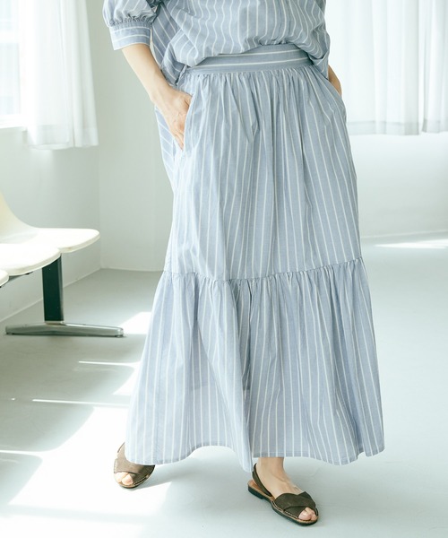 ピュアルセシン 2022 spring collection【Loose and classical】 ◇長さ調節が出来る!優秀スカート◇ ●デザイン 膝部分の切り替えから程よく広がり、綺麗なシルエットを作り出すストライプ柄のスカート。 ウエストはキュッと締め、下に行くほど広がりのあるメリハリの付いたデザインです。 ウエストはバックにゴムが入っているので、見た目以上にラフな着心地。 ウエスト部分を一折して、短く調整することも可能。 折っても、スカートシルエットが変わる事無く、 身長に限らず、足元をヒールにする時はロング丈、 スニーカーを履く時はショート丈にする、などと コーディネートに合わせたスカート丈の変化を楽しめます。 夏に向けてオススメしたい軽やかなスカートです。 ●カラー展開 異なるストライプ柄2色展開。 ●素材 タイプライターの柔らかくもハリがある生地なので キレイなシルエットをキープ。 薄手で軽く、夏場でも涼しく快適に過ごせます。 ●スタイリング カットソーからブラウスまで、幅広いトップスと好相性◎ 春にはショートブーツやスニーカー、夏にはサンダルなどスタイリングに合わせて足元のお洒落をお楽しみいただけます。 =============================== 透け感:なし 裏地:あり 伸縮性:なし 光沢感:なし 生地の厚さ:やや薄手 【スタッフコメント】 年齢:20代前半/身長:157cm/普段着用サイズ:Mサイズ サイズ感:フワッと形がしっかりしているスカートなので、窮屈感なく穿けました。 素材感:薄手で軽やかな着心地。ややハリがあるのでフレア部分が綺麗に出ます。 =============================== ※撮影場所やお使いのモニター環境により若干お色味が異なる場合がございます。特にロケの撮影では明るく見える傾向にございます。 ※予約商品はサンプルで撮影をしております。若干の仕様が変更になる場合がございますので予めご了承の上ご注文くださいますようお願いいたします 。