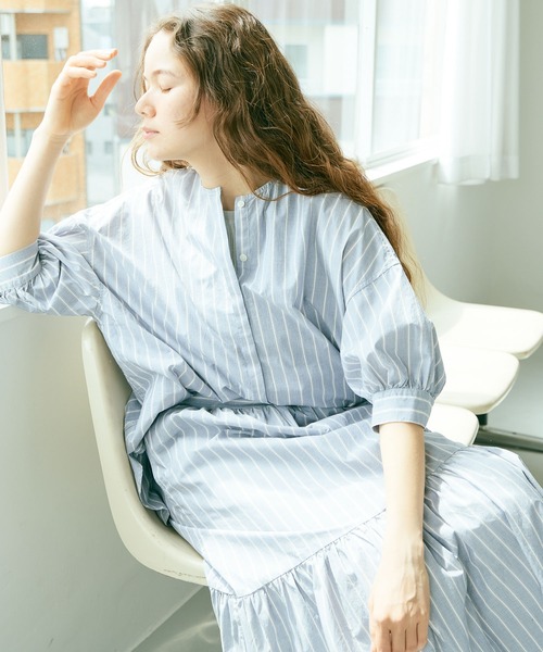 ピュアルセシン 2022 spring collection【Loose and classical】 ◇1枚持っておくとコーデの幅が広がるストライプブラウス◇ ●デザイン きっちりし過ぎないデザインが大人カジュアルなスタイリングを叶えるストライプブラウス。 首に沿うノーカラーに、甘くなりすぎない絶妙な袖のボリューム感がこなれた印象を演出。 一枚着としてはもちろん、Tシャツやタンクトップの上に羽織った着こなしも楽しめる便利なアイテムです。 ●カラー展開 異なるストライプ柄2色展開。 ●素材 やや薄手の素材感にハリ感のあるコットン素材です。 ●スタイリング 一枚着としてはもちろん、ロゴTシャツやタンクトップとのレイヤードもおすすめ。 ヒップが隠れる長めの丈なので、ワイドパンツやスラックスなど合わせて 大人カジュアルな着こなしが完成するアイテムです。 =============================== 透け感:なし 裏地:あり 伸縮性:なし 光沢感:なし 生地の厚さ:やや薄手 【スタッフコメント】 年齢:20代半ば/身長:154cm/普段着用サイズ:Mサイズ サイズ感:ゆとりをたっぷり持たせたワイドシルエット。私の身長でお尻がしっかり隠れる着丈です。 素材感:柔らかくもややハリ感があり、シルエットがきれいです。 =============================== ※撮影場所やお使いのモニター環境により若干お色味が異なる場合がございます。特にロケの撮影では明るく見える傾向にございます。 ※予約商品はサンプルで撮影をしております。若干の仕様が変更になる場合がございますので予めご了承の上ご注文くださいますようお願いいたします 。