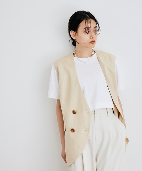 夏のレイヤードスタイルにアクセントを。シンプルなコーディネートを格上げしてくれる、リネンの風合いが魅力のジレ ◇2022春夏◇ ADAM ET ROPE' FEMME 【Material】 節のある夏らしい麻混素材。適度に張りのある風合いと、程よいドレープ性が魅力。 【Design】 カジュアルにもきちんと感あるスタイリングにも取り入れやすい、フレンドリーさのあるノーカラーのジャケット風ジレ。夏ならではの麻混素材が、爽やかな印象を与えてくれる、どんなトップスにレイヤードしても、今っぽさを感じられる一着。 【Color】 スタイリングに合わせやすいブラックと、やや黄みがかったサンドベージュの2色展開。 【Styling point】 Tシャツとデニムを合わせたベーシックなスタイルにジレを重ねたり、キャミソールやベアトップの上にジレを着て、モードな印象に仕上げるのもおすすめ。 --------------- 裏地:あり 光沢感:なし 透け感:なし ウエスト:ゴムなし ポケット:あり 伸縮性:なし 生地の厚さ:やや薄手 ボタン:あり --------------- ◇モデル情報 身長:163cm size:F