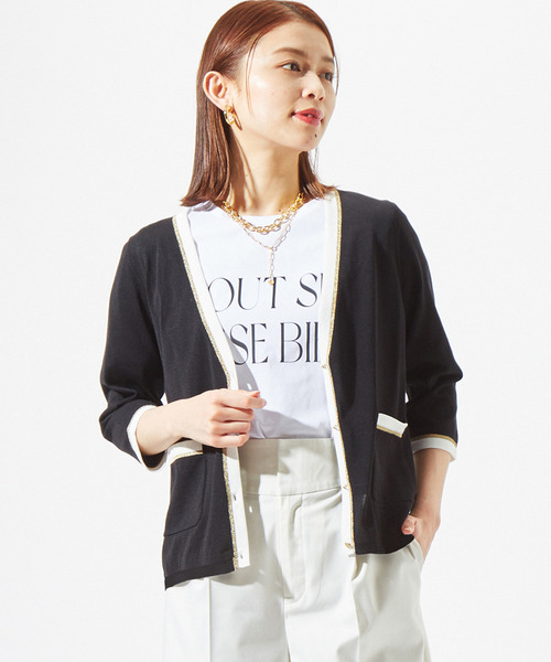 バイカラーのニットカーディガン。 コットン混のさらりとした素材感で夏でも涼しく着ていただけます。 バイカラーとゴールドラインの仕様がカジュアルになりがちな夏のカーディガンをきれい目に見せてくれるので、お仕事やお出かけなどにも重宝します。 手持ちしても軽いので、冷房対策にも。 シンプルな合繊のパンツにもデニム素材のボトムにも、合わせ方によってオンにもオフにも使えます。 A0127KSW034と合わせてアンサンブルとして着ていただくのもおすすめです。