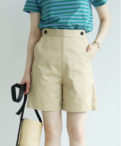 少年のようなショートパンツをつくりました。ファスナーを使わないボタン開きの仕様がこだわりです。履いたときのかたちが綺麗に見えるようにゴムは使わず、ボタンでウエストのサイズ調整ができるようになっています。 元気な印象もありつつ、少し光沢のある素材を使用することで大人が挑戦しやすい1枚に。今年は少しヒールのあるシューズやハイソックスと合わせて楽しんで◎※素材の特性、お取り扱いの注意水洗い可・・・手洗い、中性洗剤使用、柔軟剤禁止アイロン可・・・あて布使用bulle de savon(ビュルデサボン)BRAND CONCEPT女性、誰もが ふっと子供の頃を思い出し 少女のような気持ちに戻れる服。 bulle de savon =シャボン玉の事 石鹸の泡とか、においなど、 懐かしい感じ。設立年月日 1994年8月※ホワイト色、ブラック色はサンプルです。実際の商品と仕様・加工・サイズ等が若干異なる場合がございます。※モデルの着用画像は光の関係で商品の色味が若干異なります。※取り扱いの注意については取り扱い表示をよくご確認の上、着用をお願いいたします。※工場の生産の都合上、入荷の時期が前後する場合がございます。ご了承ください。