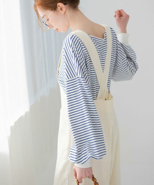 ふんわりとしたシルエットが魅力のボーダーTシャツ。 カジュアルながらも華奢見えする細ボーダーとボリューム袖で、女性らしさを演出してくれます。 サイドスリット入りでさり気なく抜け感をプラス。 デニムとの大人カジュアルなスタイルはもちろん、 スカートやワンピースと合わせたフェミニンなスタイルにもおすすめです。 袖口はリブなので腕を捲った着こなしも楽しめます。 広めに開いた衿ぐりでネックラインを綺麗に見せてくれるのも嬉しいポイント◎ 肌触りの良いコットン100%。 伸縮性のある柔らかなカットソー素材で快適な着心地です。