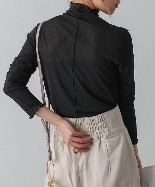 【大人の抜け感を演出してくれるハイネックシアーニット】やや透け感のあるシアー素材のシンプルなシアータートルネックトップス。大人っぽいイメージになるシアートップスですが、首元や袖がメローになっているので大人っぽさとかわいいさを兼ね備えた1着。伸縮性のある生地感でボディラインを拾いすぎないサイズ感なのも嬉しいポイント。合わせるアイテムを選ばず、レイヤードスタイルで活躍する万能アイテムです◎・程よいシアーが女性らしい旬なデザイン・身体を華奢に見せてくれるすっきりとしたシルエット・レイヤードスタイリングなど様々なスタイリングが楽しめます【コーディネート】ブラトップやキャミソール、タンクを重ねてそのままサラッと着るのはもちろん、ワンピースやサロペット、ビスチェのインナーとしても◎首元や袖口のメローがポイントがポイントになるのでスウェット、シャツやブラウスからちらっと見せるのもおすすめです。1枚取り入れるだけでトレンドコーデに仕上がる今シーズンのおすすめアイテムです。※着用しているインナーはセットではございません。■素材・洗濯について素材:ポリエステル100%洗濯:手洗い可※着用、お取り扱いの際は、商品についている品質表示とアテンションタグを必ずご確認下さい。※商品タグに記載されている商品名がWEBでの表記名と異なる場合があります。※画像の商品はサンプルです。実際の商品と仕様、加工、サイズが若干異なる場合がございます。 ※照明の関係により、実際よりもやや明るく見える場合がございます。またパソコンなどの環境により、若干製品と画像のカラーが異なる場合もございます。予めご了承くださいませ。 【お気に入り登録】してお得な情報をCHECK!!・「商品のお気に入り登録」で再入荷通知や、ラストの通知、セール通知も受け取ることができます。・「ブランドのお気に入り登録」で新商品や再入荷など、お得な情報を受け取ることができます。