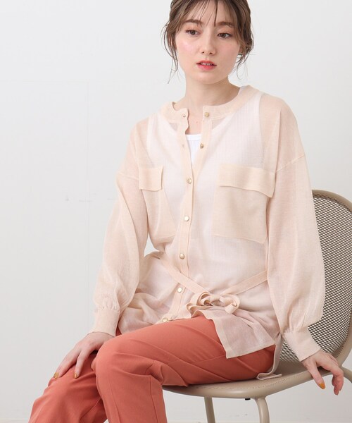 【デザイン】 ゆったりしたシルエットのシャツ風ニットカーディガンです。 ニットで編み立てたシャツ風のデザインに、フラップ付きの両胸ポケットがポイントです。 シアー感のある素材なので、Tシャツやタンクトップをインナーにワイドパンツを合わせたシンプルなスタイリングがおすすめです。 フロントを閉じてトップスとしても、前を開けて羽織としても着用しても◎ また共のベルトがついているので、2、3個ボタンをあけてウエストマークしたニュアンスのあるスタイルもおススメです。 ※ポケット数:胸元×2 【生地感】 さらりとドライタッチで、ラメ感のある光沢が可愛らしい透け感のあるニット素材を使用しています。 ※こちらの商品は透け感があります。 モデル情報:身長163cm B81 W56 H82 着用サイズ:02(M) 店舗へのお問い合わせ商品番号:741-34015 ●製品寸法: 02(M):着丈69cm B104cm 袖丈44cm 肩幅58cm 付属ヒモ全長168cm 付属ヒモ幅2cm 03(L):着丈70cm B112cm 袖丈44cm 肩幅61cm 付属ヒモ全長168cm 付属ヒモ幅2cm 備考: