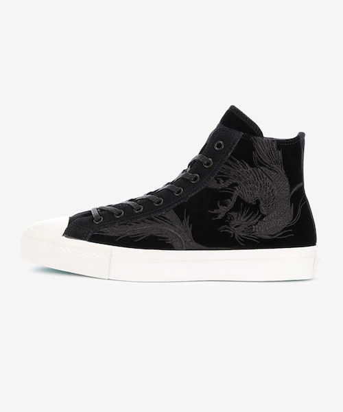 2018年秋冬から始動した<コンバース スケートボーディング>のリアルスケーターに向けた本格仕様の+(プラス)シリーズ発、マルチに活動するプロスケーターの上野伸平が手掛けた自身のシグネチャーモデル第2弾。定番モデルのCX PRO SK HIをベースに採用し、内側にメタルジッパーを配して着脱しやすいようにカスタマイズ。ベルベット素材のアッパーに上野氏の脚に入る鳳凰のタトゥーを刺繍で落とし込み、ターコイズブルーの差し色で彩りを添えたクールな装いの意欲作。