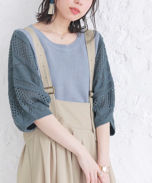 繊細な透かし編みデザインと配色が魅せる、ゆるっとこなれるドルマンニット。 袖の透け感と、細見え効果のある身頃の切り替えラインがこだわりのポイント♪ゆるっと、でも見た目はすっきりと着こなせる絶妙バランスで、周りと差のつくお洒落を実現します。 涼しげな透かし編みニット×透けにくいガーター編みニットの表情豊かな組み合わせ。 程よい薄さで柔らかく、ニットだけど通気性がいいからこれからの季節にぴったりの一着です。 着心地もお洒落も譲れない≪n'OrLABEL≫透かし編み配色ドルマンニットです。