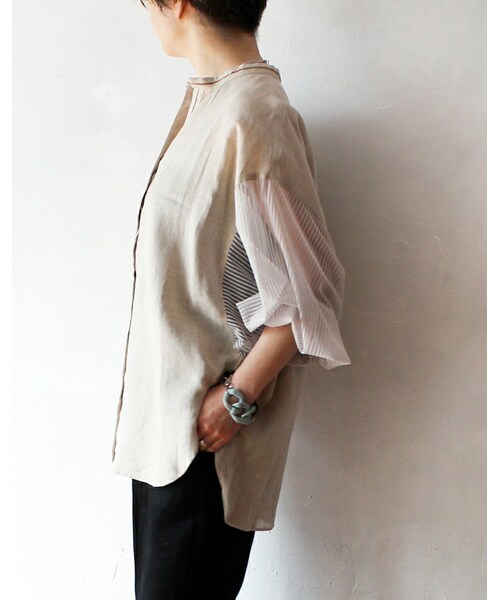 『マイノリティファン』のオリジナルブランド『L'Ancre(アンカー)』の新作、オリエンタルリネンバルーンシャツ。 夏らしい鮮やかな”エスニック”や”オリエンタル”ではなく、メンズの正装にみられるような、もっとシンプルでミニマル、凛としたイメージで作りました。 配色のライン使いやバルーンスルーブ、透け感のある素材とのバランスで、さり気なく可愛らしさや柔らかさをプラス。1枚でシャツとしての着こなしから、さらっと羽織る着こなしまでし易いシンプルさが魅力。 カラダが中で泳ぐサイズ感で風を通すので、肌にも着心地が良く、これからくる暑い夏を過ごすにもピッタリです! minoriTY-funにしかない、『L’Ancre』は日常着であるとともに、大人のカラダをバランス良く見せるシルエットと、ちょっと気の利いたデザインでお洒落ゴコロをくすぐる服を作ります。 (着用モデル身長:163cm)