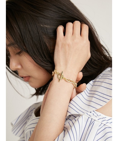 【クールな存在感でスタイリングにスパイスを添えるチェーンブレスレット】 【Design/Styling】 絶妙な太さで存在感のあるモチーフチェーンを用いたクールな表情のブレスレット。女性らしいラインで品良く仕上げているので、合わせるコーディネートを選ばず幅広く活躍してくれます。留め具部分にはブランドロゴ入りのチャームをあしらい、細部まで抜かりなく仕上げています。 ※照明の関係により、実際よりも色味が違って見える場合があります。 またパソコン・スマートフォンなどの環境により、若干製品と画像のカラーが異なる場合もございます。予めご了承ください。 商品の色味は、商品単品画像をご参照下さい。 ※商品画像はサンプルのため、色味やサイズ等の仕様に変更がある場合がございますので、予めご了承ください。