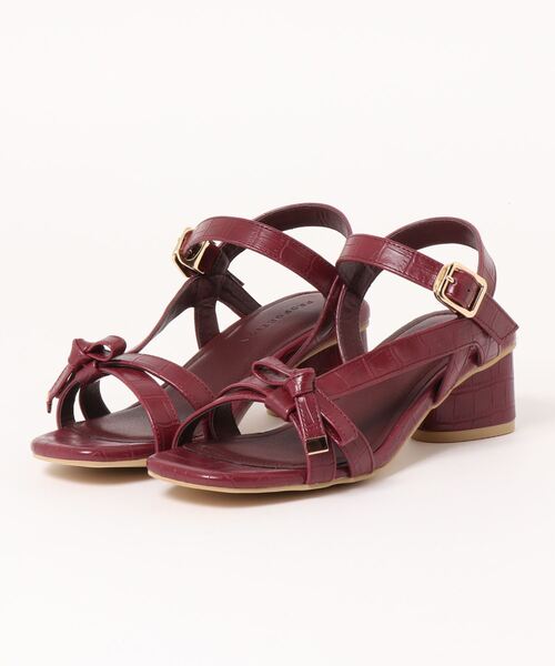 甲をリボンディテールで飾ったサンダル。やや太さのあるヒール部分で安定した履き心地と三角の形状もさりげないポイントになります。足首を華奢に見せるアンクルストラップは、一度サイズ調節をすれば金具パーツ部分でひっかけでの着脱が可能。うっすらと型押し風の素材が品のいい春夏スタイルのアクセントになります。