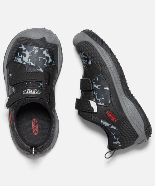 ランニングバイクなどのアクションスポーツに最適なパフォーマンスソールを搭載したKEEN ALL CONDITION SHOES.指の可動域が広がるアッパーパターンに、耐久性に優れるマテリアルを採用。アクションスポーツから通学、キャンプまで幅広い用途に対応。 ■素材 ・UPPER : アッパーには軽量で丈夫なシンセティックマテリアルと通気性を高めるメッシュを採用 ・FOOTBED : 足裏の形状に合わせて立体成型された、取り外し可能なEVAフットベッドが快適なクッション性を発揮 ・MIDSOLE : クッション性に優れ、リサイクルも可能なTPRミッドソール ・OUTSOLE : タイヤトレッドトラクションアウトソールが舗装路から締まったダートまで高いグリップ性を発揮、踏み跡を残さず耐摩耗性に優れたノンマーキング仕様 ■特徴 ・甲をホールドし、脱ぎ履きを容易にする調節可能なダブルストラップの面ファスナーと掴みやすいリフレクター付きクロージャータブを採用 ・動いても動いても快適な速乾性ライニング SPEED HOUND / 1026213 ( BLACK/CAMO) スニーカー / 男の子 / 女の子 / 子供 / 靴 / キッズシューズ / 運動靴 / つま先保護