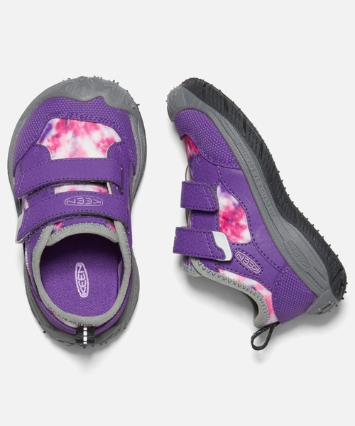 ランニングバイクなどのアクションスポーツに最適なパフォーマンスソールを搭載したKEEN ALL CONDITION SHOES.指の可動域が広がるアッパーパターンに、耐久性に優れるマテリアルを採用。アクションスポーツから通学、キャンプまで幅広い用途に対応。■素材・UPPER : アッパーには軽量で丈夫なシンセティックマテリアルと通気性を高めるメッシュを採用・FOOTBED : 足裏の形状に合わせて立体成型された、取り外し可能なEVAフットベッドが快適なクッション性を発揮・MIDSOLE : クッション性に優れ、リサイクルも可能なTPRミッドソール・OUTSOLE : タイヤトレッドトラクションアウトソールが舗装路から締まったダートまで高いグリップ性を発揮、踏み跡を残さず耐摩耗性に優れたノンマーキング仕様■特徴・甲をホールドし、脱ぎ履きを容易にする調節可能なダブルストラップの面ファスナーと掴みやすいリフレクター付きクロージャータブを採用・動いても動いても快適な速乾性ライニングSPEED HOUND / 1026481 ( TILLANDSIA PURPLE/MULTI)スニーカー / 男の子 / 女の子 / 子供 / 靴 / キッズシューズ / 運動靴 / つま先保護