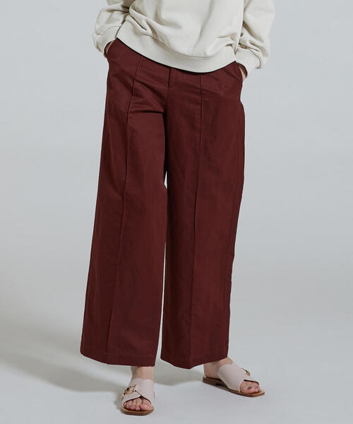 コットンとリネンを高密度に織り上げ、仕上げ加工で揉み込むことで膨らみとナチュラルな風合いを表現したツイル素材のパンツ。 リネン混ならではのスラブ感とハリ、ツヤで上品な表情に仕上がっています。 リラックス感のある絶妙な太さのワイドシルエットをハイウエストのデザインとややタイトなヒップまわりですっきりとしたバランスに。 センターに施したコバステッチがシャープなアクセントをプラスしています。 カットソーとのヘルシーな着こなしはもちろん、リブニットやブラウスを合わせてきれいめに着こなすのもおすすめ。 手洗い可能で扱いやすく、夏のデイリーウエアとして活躍してくれるアイテムです。 2022SS商品 店舗にお問い合わせの際は、下記の商品番号をお申し付けください。 商品番号:12-04-22-04433