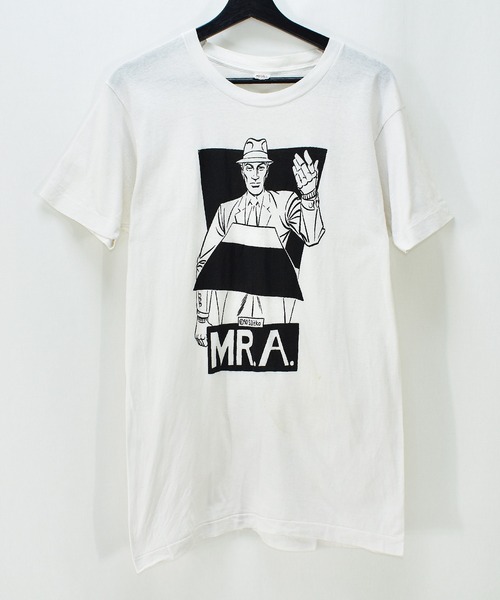 -素材の特徴- ・1980年代、フルーツオブザルームボディを採用。 ・薄手で柔らかく着心地の良い生地感。 -デザインの特徴- ・80's、アメリカンコミックスの『MR.A』Tシャツ。 ・ホワイト。 ・ブラックの単色プリント。 ・袖、裾ともにシングルステッチ。 ・USA製、Lサイズ表記。 -スタッフコメント- スタン・リーと共にスパイダーマンやドクターストレンジを創作したことでも有名なスティーヴ・ディッコ。 彼の代表作のひとつでもある『MR.A』のTシャツです。 白と黒のパキッとしたプリントは存在感があって◎ ユニセックスでどうぞ。 -状態- 着用感,フロントに大きなシミ ーーーーーーーーーーーーーーーーーーーーーーーーーーーーーー こちらはヴィンテージ商品のため1点ものです。 交換・修理はいたしかねます。 ヴィンテージ商品につき、どちらの商品にもシミ・ダメージ・使用感が多少ございます。 このようなヴィンテージ商品の性質を十分ご理解いただいた上で、ご注文くださいますようお願いいたします。 商品状態につきましては詳細にお伝えするよう努めておりますが、細かな点の表記には限りがございます。 画像につきましても、実商品の色味に近しいものを掲載するよう心がけておりますが屋内での撮影のため、多少の誤差が生じる場合がございます。 どうかご理解いただけますようお願いいたします。 ーーーーーーーーーーーーーーーーーーーーーーーーーーーーーー