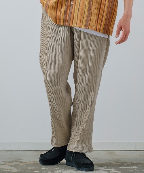 涼し気なランダムプリーツ生地を使用した、はき心地バツグンのイージーパンツ。 ●縦方向にシボ感を表現したプリーツ生地を使用 ●さらりとした触感、涼感のあるライトタッチはまさに春夏にピッタリ ●ゴムウエストにはドローコード付きでルームウェア、ワンマイルウェアとしても◎ ●ゆったりしたワイドシルエットなサイズ感も今どき顔 ●見た目の品の良さと快適さから、どんなシーンでも活躍 カットソーやシャツと合わせるだけでコナレた佇まいを作り出すイージーワイドパンツ。 涼し気な質感と見た目で夏にもぴったりなボトムスです。 メンズはもちろん、レディースにもオススメしたい一本です。