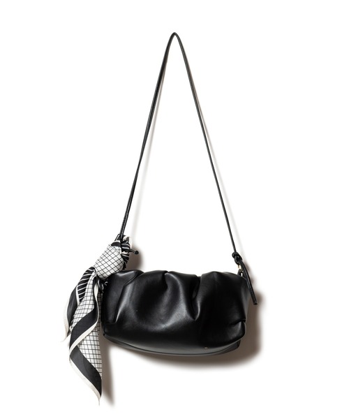 合皮素材で取り扱いが楽なScarf bag(スカーフバッグ)。ころんと丸いフォルムの中は実は収納力抜群。長財布でもしっかり収納でき、携帯、ハンカチ、コスメなど荷物が多い方も安心です。スカーフもついており、ポイントとしてストラップに巻いたり、カバン全体を包む様に結んで、柄を見せたり、全く違う雰囲気にもできるのが特徴です。