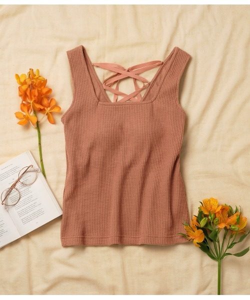 レースアップがヘルシーなアイキャッチ。ブラ不要、1枚で着られるパッド入り。 お部屋でくつろぐのはもちろん、ちょっとしたお出かけもOKなリラックスウエアのシリーズです。表面に格子状の凹凸があるワッフル素材は適度な厚みがあり、ふわっと柔らか。ボディラインを拾いすぎないのでインナーが響きにくく、1枚で着やすいのもうれしいポイントです。「パデットタンク」は背中にトレンドのレースアップディテール。フロントはシンプルなスクエアネックです。ブラなしで着られるパッド入りで、軽いエクササイズにも。腰骨くらいの丈。ボトムとの組み合わせでギフトにも。 [カップ裏] 身頃上部にコットン混天竺のインナーパネル付きで、取り外しできる薄手のパッド入り。アンダーバスト一周に平ゴム付きでボディにフィット。