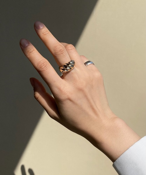 y/m×RIKAヴィンテージライクなワイドリング。■デザインねじれたストライプデザインがヴィンテージライクなボリュームリング。古着屋さんの片隅に置いてありそうなレトロな雰囲気のデザインです。■コーディネートカジュアルや古着MIXなコーディネートに良く合うデザイン。柄物のトップスやワンピースなどとコーディネートするとより高見えします。【y/m×RIKA】rikasato_シンプルだけどお洒落に見える。かっこいいけど女性らしい。高そうに見えて手にとりやすい。 お洒落を楽しむ女性のちょっとワガママな気持ちに寄り添うアイテムを、カラーリングとシルエットにこだわったデザインとセレクトでお届けしていきます。【お買い物をよりお楽しみいただく為に】▼商品のお気に入り登録お気に入りアイテムの値下げ・再入荷・ラスト1点などの通知を受け取ることができます。▼ブランドのお気に入り登録新商品や再入荷、セール、クーポン配布などいち早くお得な情報を受け取ることができます。※撮影商品はサンプルの為、実際の仕様と異なる場合がございます。※画像の商品は光の照射や角度、お使いのモニター環境により、実物と色味が異なる場合がございます。品番:523FSS56-0860品名:ストライプワイドリング