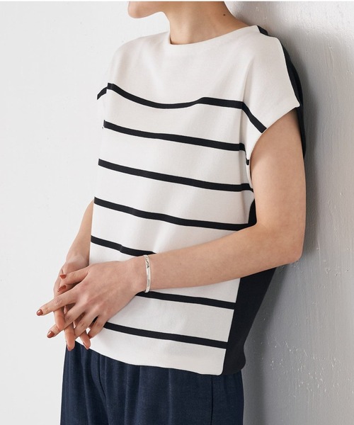 綿・ポリエステル素材のスムース編みのフレンチスリーブニット。暑い時期にさらっと着られる薄手ながら、透け感はなく安心感のある着心地です。ホワイトはフロントがボーダー柄、バックスタイルは無地のブラック、ブルーは前後同柄で色違いで揃えたくなる1着。前後どちらでも着用ができ、裾のドローコードを絞ればシルエットの変化を楽しめる着回し力抜群のひと品です。伸縮性:あり透け感:なし裏地 :なし《商品画像について》ご覧頂いている商品の写真につきましては、できるだけ実物の色に近くなるように努めておりますが お使いの環境(モニター、ブラウザ等)の違いにより、色の見え方が実物と若干異なる場合がございます。 予めご了承ください。《予約商品について》・こちらの商品はサンプルでの撮影・計測となっております。実際の商品とは、商品の一部仕様が変更になる場合がございます。・サンプルの為、混率の詳細が確定しておりません。確定次第、記載いたします。・工場の生産の都合上、納期が変更になる場合がございます。発送日の前後についてはあらかじめご了承ください。・入荷状況により、お客様への発送が店頭販売より遅れる場合もございます。《ハートをタップして商品のお気に入り登録》登録カラーの商品の「残りわずか」「再入荷」「値下げ」通知を受け取ることができます。ブランドフォロー 新商品などの入荷情報、最新のニュースやお得な情報を受け取ることができます。