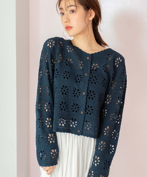 着るだけで毎日がハッピーになる “カジュアルポップ”なスタイルを提案◎ フラワー模様のすかし編みが可愛いカーディガンクラフト感のあるフラワー模様のすかし編みが印象的なカーディガン。ほどよい透け感が魅力で、抜け感のあるスタイリングを叶えてくれます。コンパクトな着丈なので、ボリュームのあるボトムスやワンピースともバランス良く合わせられるアイテムです。 ※撮影時のライティング、PCやスマートフォンの環境により写真の色味が実際の商品と異なって見える場合がございます。ご了承の上お買い求め下さいませ。 ※モデル着用画像は実際の色と多少異なる場合がございますのでマネキン画像をご確認ください。 《 お知らせ 》 ▼商品のお気に入り登録 お気に入りアイテムの値下げ・再入荷・在庫1点などの通知を受け取ることができます。 ▼ブランドのお気に入り登録 新商品や再入荷、セール、クーポン配布などお得な情報を受け取ることができます。