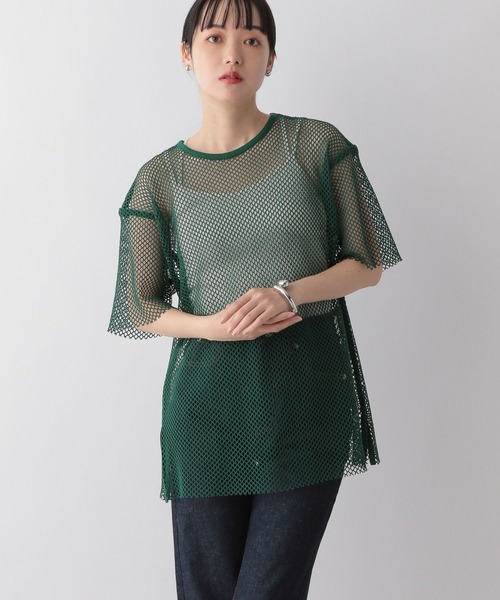 ◆素材◆ ポリエステル100のメッシュ素材を使用しています。ドライタッチで適度なハリ感があるのが特徴です。 ◆デザイン◆ レイヤードしやすい様、ゆったりとしたサイズ感にしたメッシュ素材のTシャツです。 衿元はパイピングにして華奢見えさせることでカジュアルになりすぎないようにしました。 ◆スタイリング◆ タイト目なスカートとの合わせや程よい透け感なので、 下にTシャツや柄タンクなどをレイヤードするのもオススメです。