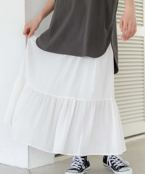 ふんわり広がるティアードデザインがフェミニンなミディスカート凹凸のある生地が表情をプラスする、ミディ丈のスカート。ギャザー切り替えでふんわり広がるティアードデザインが、フェミニンな雰囲気を演出します。ウエスト部分はゴム仕様になっているので、ストレスフリーな穿き心地なのも嬉しいポイントです。※撮影時のライティング、PCやスマートフォンの環境により写真の色味が実際の商品と異なって見える場合がございます。ご了承の上お買い求め下さいませ。※モデル着用画像は実際の色と多少異なる場合がございますのでマネキン画像をご確認ください。《 お知らせ 》▼商品のお気に入り登録お気に入りアイテムの値下げ・再入荷・在庫1点などの通知を受け取ることができます。▼ブランドのお気に入り登録新商品や再入荷、セール、クーポン配布などお得な情報を受け取ることができます。