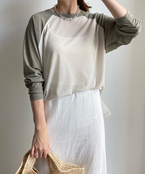 ■2022 SPRING & SUMMER ITEM■ 今年らしい着こなしが叶うアイテム トレンドのラグランTシャツをシアー素材で仕上げた1着。 透けすぎずに、でもシアー感のある絶妙な素材感がおしゃれ且つ、女性らしく決まります。 シンプルで着回ししやすく、デニムやカラーパンツ等のパンツ合わせやスカートはもちろん、シャツやキャミワンピースなどのインナーとしても着用できるので、1着持っておくと万能なアイテムですよ。 - POINT - ・程よい抜け感を叶える ・トレンド感のあるラグランデザイン ・シンプルで着回し力抜群 -------------------------------- 洗濯:手洗い可能 透け感: あり 裏地: なし 伸縮性: ややあり 光沢感: なし -------------------------------- 【 ♡ をクリックでお得な情報をお知らせいたします 】 〈 商品のお気に入り登録 〉 お気に入りアイテムのお値下げ・再入荷・在庫ラスト1点など通知を受けることができます。 〈 ブランドのお気に入り登録 〉 DOUDOUの新商品や再入荷、セール、クーポン配布などお得な情報を受けることができます。 -------------------------------------- ※ 生産の都合上、お届け時期が前後する場合がございます。 ※ 掲載画像の商品の色味は、 撮影場所や光の当たり具合などにより色味が異なって見える場合がございます。 また、お客様のお使いのPC・スマートフォン等のモニター環境などにより色味が異なって見える場合がございます。予めご了承の上ご注文ください。 ※ 着用、お取り扱いの際は、商品についている品質表示とアテンションタグを必ずご確認下さい。