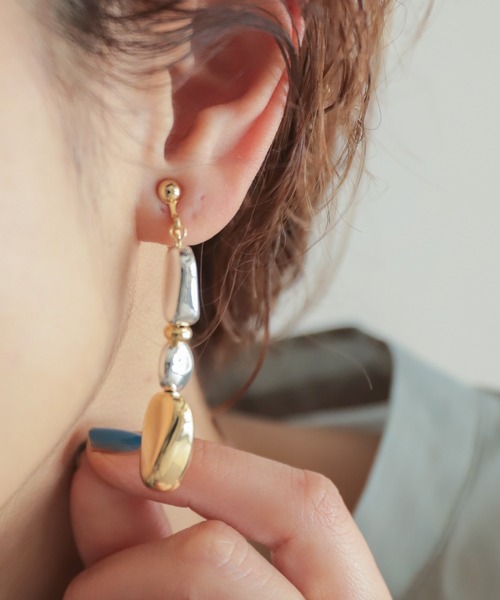 【rapiécage ラピエサージュ】 ■メタルビーズロングイヤリング 石のような不揃いの形がナチュラルな印象のモチーフ。ゴールドとシルバーを交互に繋げたMIX感とボリューム感が、夏らしく華やかなアクセントに。 揺れるデザインで女性らしく、まとめた髪やショートとも好バランスが作れます。 樹脂パーツに圧縮タイプのメタル加工を施したビーズを使用しているので軽く、つけた際の負担が少ないのもポイント。 レイヤード要らずで存在感のあるアイテム。 Tシャツなどシンプルになりがちな夏の装いに取り入れて、スタイリングが完成します。 ※商品はrapiécageオリジナルBOXに入れてのお届けになります。 ※イヤリングパーツはねじバネ式で自分で調整できるので、痛みもなく安心して使用いただけます。 ※同じビーズを使用したネックレス(お問い合わせコード:63902072)も展開がございます。