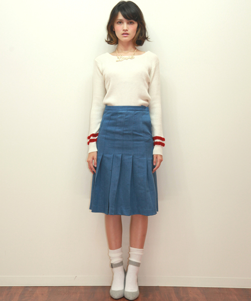 柔らかさが特徴のカットデニムを使用したプリーツスカートです。途中まで縫いとめたプリーツが女性らしいシルエットに見せてくれます。長めの丈で今年らしいコーディネートを楽しんでいただけます。トップスをインやあえてオーバーシルエットのニットを合わせるスタイリングもオススメです。