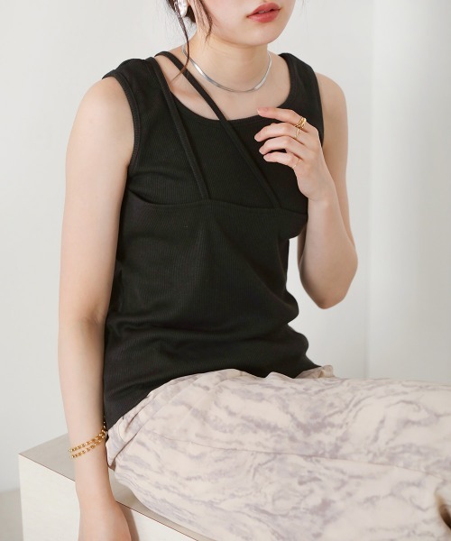 ●Bab● ■POINT 肩のデザインがアシンメトリーになったタンクトップ。レイヤード風のストラップが2本渡ったデザインで前後2wayで着用できるのもポイントです◎ デコルテをすっきり見せた衿ぐりと全体的にシンプルなシルエットで女性らしい1着に仕上げています。 カラーも豊富に展開しているのでお手持ちのアイテムに合うお色で合わせていただけます。 ■FABRIC 伸縮性のあるリブ素材でインナーとしての着心地は抜群◎程よい厚みで透けも気になりません。 ■COORDINATE インナーとして着用いただけるので、シアー素材やメッシュのニットなどちょっとしたデザインテクニックをチラ見せしながらコーディネートを楽しんでいただけるアイテム。もちろんトップス1枚として着ることもできるので、シンプルにデニムやスカートなどとコーディネートするだけでこなれ感のあるスタイリングが完成します♪ ………………… 透け感:なし 裏地:なし ………………… ※撮影環境により、多少実際のカラーと異なる場合がございます。また、携帯やスマートフォン、パソコンなどの画面上と実物では多少色が異なって見える場合がございます。ご了承下さいませ。 ※画像の商品はサンプルのため、実際の商品と若干仕様が異なる場合がございます。 ※濃色品は、過度な摩擦や濡れた状態での摩擦により、色落ち・色移りをする恐れがあります。 ※この商品は、素材の特性上、洗濯の際に多少の縮みが生じる恐れがあります。洗濯後は形を整えてから干してください。 ※その他お取り扱いに関しましては、商品に付属のアテンションタグをご覧ください。 ★商品のお気に入り登録 再入荷やラスト1点のお知らせ、セール情報などお知らせを受け取ることができます! ★ブランドのお気に入り登録 新商品や再入荷などのお得な情報を受け取ることができますので、是非ご登録ください。