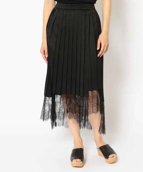 光沢のあるプリーツスカートで、巻きスカートの様なデザインになっています。折り重なっていく方向へ着丈も変わっています。プリーツ下にはレース生地の切り替え。此方もプリーツ部分と同様にプリーツ仕様になっています。ウエストは後ろ側のみゴムが入っており、サイドファスナーで着脱も簡単。ブラックカラーでありながら重たい印象はなく、軽やかで今季オススメの一着です。ADDICT NOIR[アディクト ノアー]“ADDICT”にどんな時も刺激的なFASHION LIFEを楽しんで欲しいという願いを込め、どんな色も塗り潰す事が出来ない強いカラーNOIR(黒)をコンセプトにしたブランド。個性のある芯を持った女性へ、時に強く、優しく、儚く女性の精神の全てを表現するTOKYOのMODE STYLEを提案。