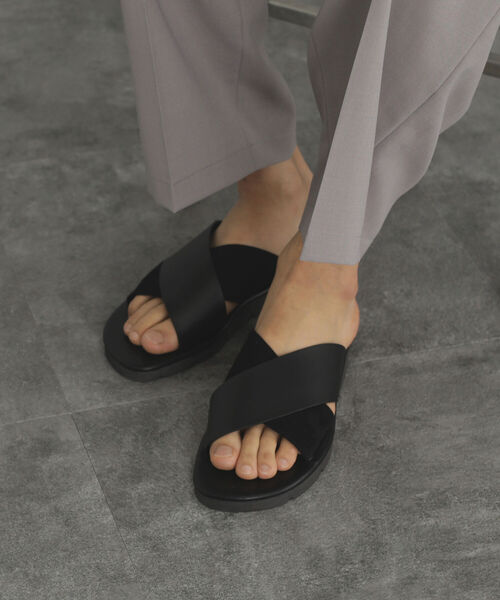 絶妙な素材使いが魅力 クロスしたベルトが特徴的な、シックな印象のソックオンタイプのサンダル。 合皮とフェイクスエードのコンビ使いがこだわりのポイントで、デザイン性の高いひと品。 素材の表情が異なることで、ワントーンでありながらさりげない個性を演出します。 裸足でもソックスでも、幅広い時期に着用いただける万能アイテムです。 ※商品の色味は白背景商品単体で撮影した画像をご参照ください。 ※屋外撮影による光の当たり具合やパソコンなどの閲覧環境によって、実際の色味と異なって見える場合がございます。予めご了承ください。
