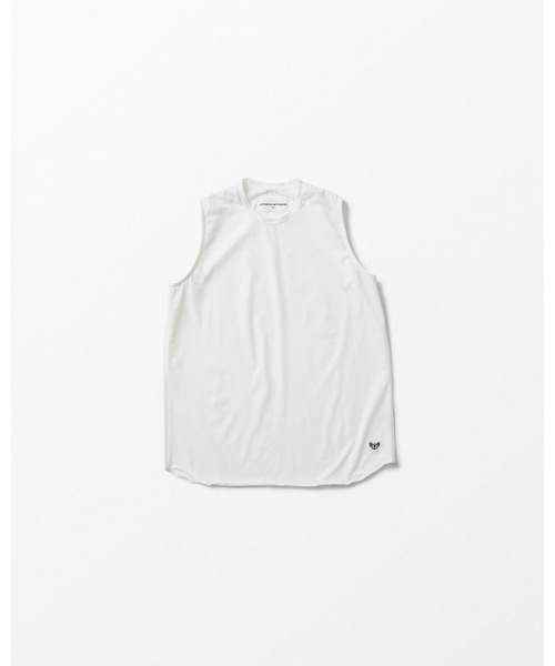 ■スリーブレスシャツ。糸表面上に微細な溝が多数ある素材「DRYMASTER Spun」を使用したスリーブレスシャツです。素材の毛細血管作用により吸水速乾に優れた一枚。インナーとして使いやすいベーシックなホワイトとグレーに加えて、素材特有の発色の良さを生かしたイエローをラインナップ。左裾にワンポイント刺繍が入っています。