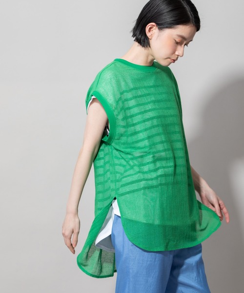 □ 2022 SPRING & SUMMER COLLECTION □ ◆今シーズントレンドのシアー感を楽しめるラッセル編みトップス◆ <MATERIAL> ラッセル組織の横糸に太番手のブークレー糸を挿入することで、ナチュラルな表面感を表現した素材です。 ブークレーのポコポコとした表面感と、ラッセルのスカッとした組織が涼し気な印象で、一般的なラッセル素材よりも目が細かいので華奢で上品な印象もあり、クセがなく使い易い素材です。 布帛ライクなハリ感もありますが、カットソーならではの着心地の良さも持ち合わせており、トレンドのクロシェ編みニットの様なざっくり感が楽しめるのもこの素材の特徴です。 <DESIGN> ゆるっと着られるカジュアル感のあるシルエットで、特徴的な素材感ですが、衿と袖口をフライスでこなす事でカジュアルな印象を加え、普段使いしやすいアイテムに仕上げました。 中にインナーを仕込んだ涼しげなコーディネートはもちろん、柄物や配色のインナーを下に重ねて透け感を楽しむコーディネートもおススメです。 少し長めのラウンドヘムなので秋には、上にスエットや、ニットを重ねて裾をのぞかせるレイヤードスタイルにも使えるので、季節問わず見た目以上に万能なアイテムです。 <COLOR> ■キナリ:清潔感のあるエクリュカラー。黄味がそこまで強くない絶妙な色味でコーディネートもしやすい万能カラーです。 ■ブラック:引き締め効果もありシャープなイメージのブラック。涼しげな透け感なのでさっぱりと着られる夏のブラックアイテムに仕上がっています。 ■モカ:程よい赤みのあるモカブラウン。一枚プラスするだけでトレンド感のあるコーディネートに。 ■グリーン:目を引く鮮やかなグリーン。透け感のある素材なので強くなりすぎず、抜け感のある差し色に。ボーダーのカットソーなどど合わせるのもおすすめです。 *光のあたり具合いやパソコンなどのモニター環境によって実際の色味と異なって見える場合がございます。予めご了承ください。 *お取扱いについては、商品についております品質表示にてご確認ください。 洗濯:手洗い可 .............................≪INFORMATION ≫............................ ▼商品のお気に入り登録▼ 『♡』マークを押してお気に入り登録して頂いた商品は、セール開催の通知やクーポン発行などのキャンペーンなど、お得な情報をいち早く受けとる事が出来ますので、ぜひご登録ください。