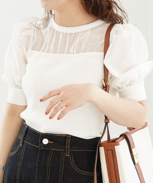 ■切り替えし部分がポイントに■ニット素材とシアーのきりかえしデザインがポイントのトップスはフェミニンが好きな方におすすめ。袖口はキュッとメリハリもついていてふんわりとしたパフスリーブは女性らしさも◎スカート合わせはもちろんデニムでカジュアルダウンさせて着るのもおすすめです♪ーーーーーーーーーーーーーーー透け感:あり裏地:なし伸縮性:あり光沢感:ややあり生地厚さ:普通洗濯方法:手洗い可※詳しいお手入れ方法は商品についているタグをご覧くださいーーーーーーーーーーーーーーー※ご利用のモニター環境により、実際の色味と多少異なる場合がございます。… information … 欲しいitemをお気に入り登録(♡マークをclick) ・お買いのがし対策…完売itemの再入荷やラスト1点の情報をお知らせ ・欲しいitemをお得にget…pricedownになったらいち早くお知らせ ・スムーズ検索…ZOZOのお気に入りアイテムページで簡単checkできるから、再検索不要♪